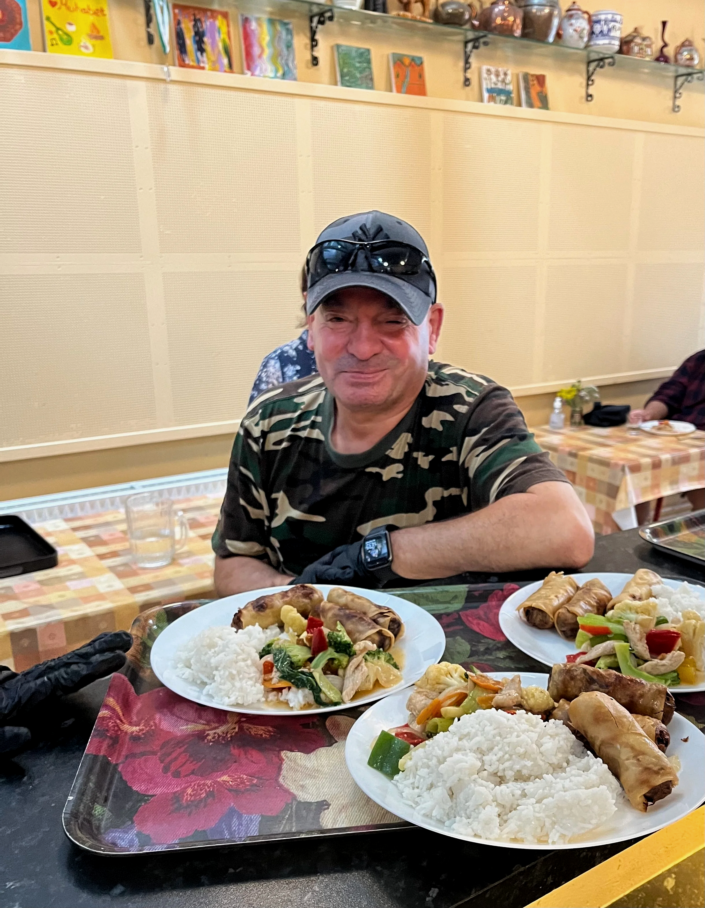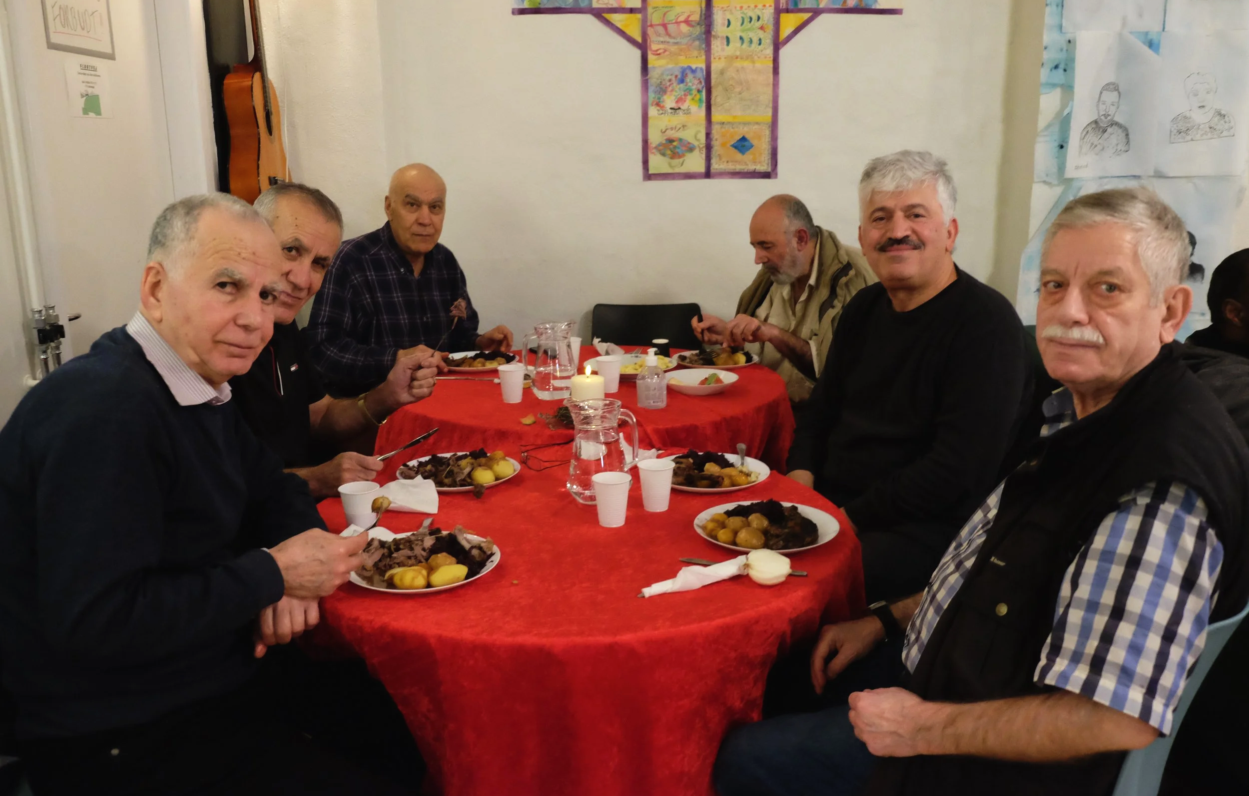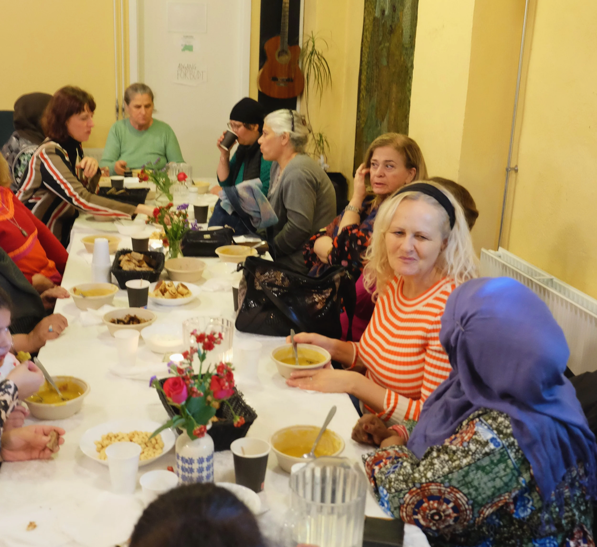 Muhabet tilbyder fællesspisning hver dag, hvor der serveres sunde og nærende måltider, som vi indtager i et hyggeligt fællesskab. Retterne er primært tilberedt af overskudsmad fra vores lokale donorer. Der serveres morgenmad og frokost mandag, onsdag og fredag samt brunch tirsdag og torsdag.